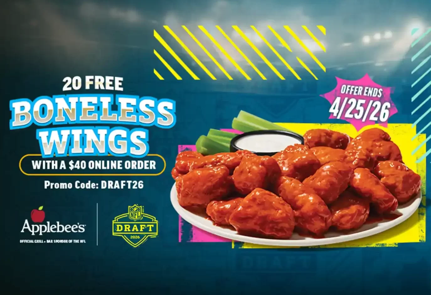 As the Official Grill + Bar Sponsor of the NFL, Applebee’s is offering 20 FREE Boneless Wings with a $40 online order at participating locations — from April 23 to 25, 2026. Use promo code DRAFT26 at checkout.