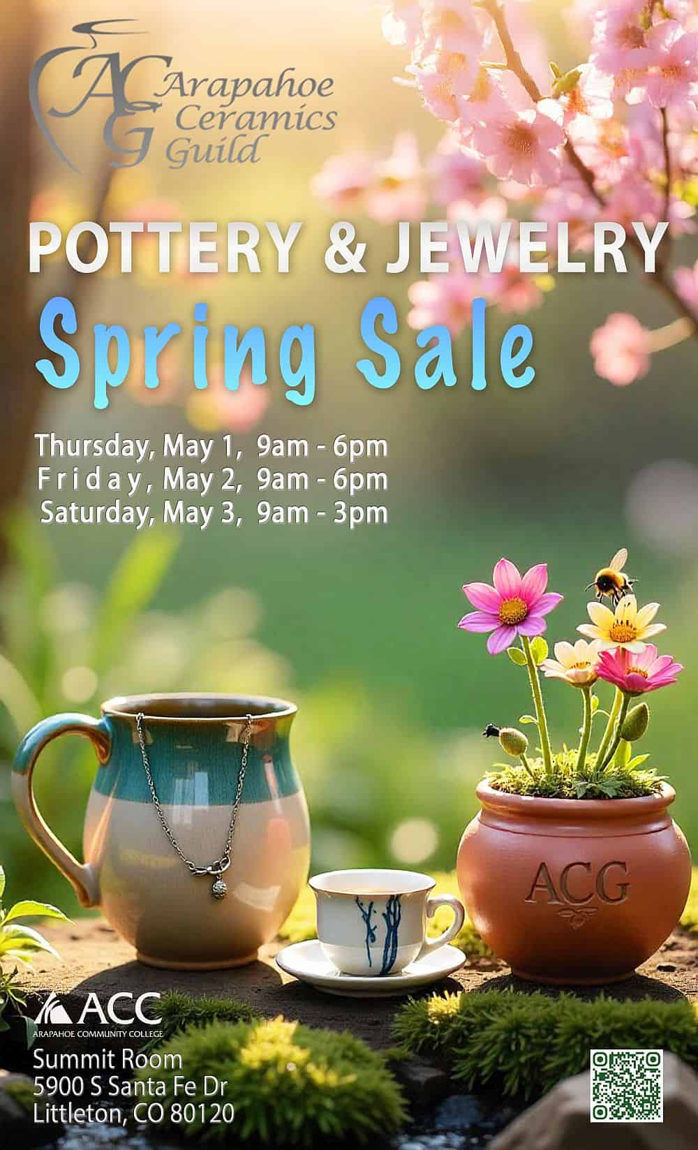 Nearly 30 ceramic artists, plus jewelry artists will showcase their work at the Arapahoe Ceramics Guild Spring Pottery Sale. The events runs Thursday to Saturday, May 1 to 3, 2025, in the Summit Room of Arapahoe Community College. Not only will you find some beautiful wares, but also prices for every budget.