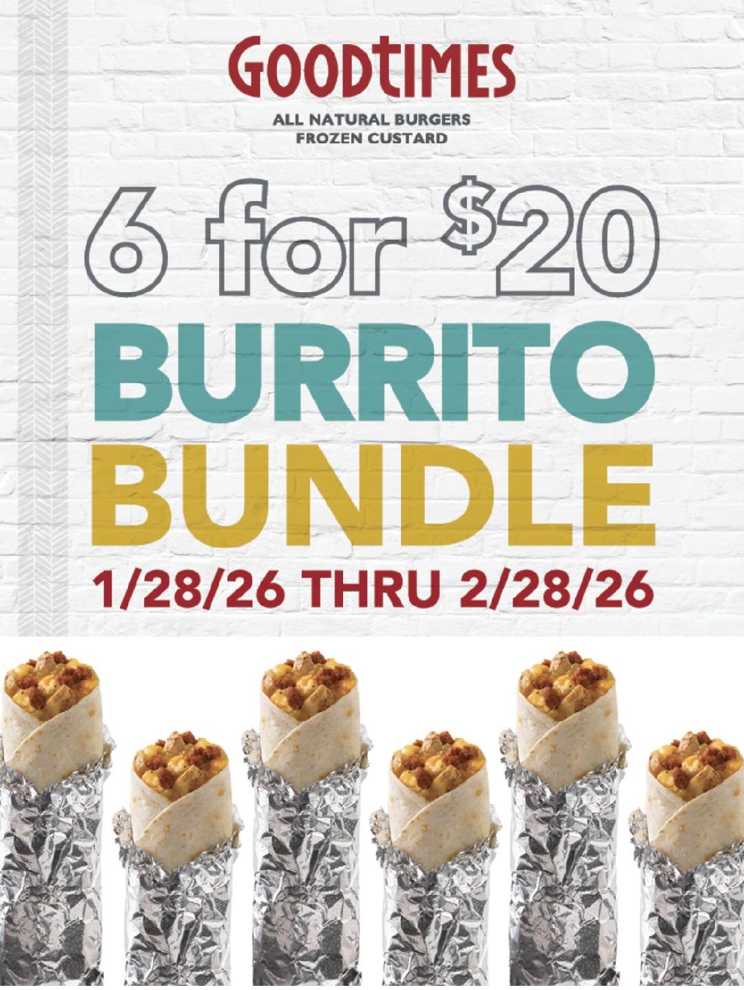 From January 28 to February 28, 2026, Good Times is offering a 6 for $20 Burrito Bundle at participating locations — making each burrito just $3.33.