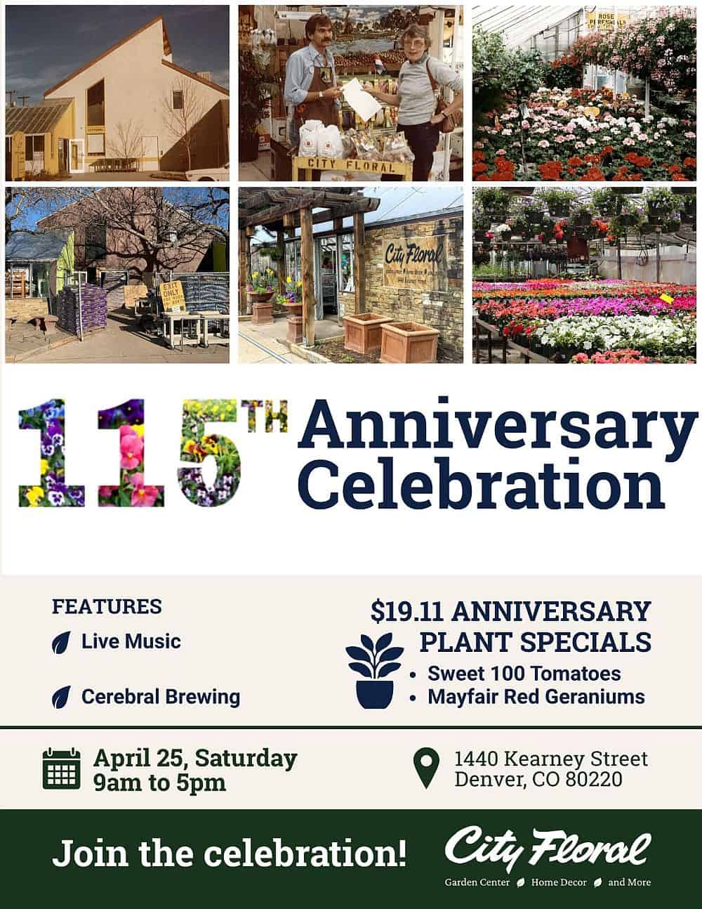 City Floral Garden Center in Denver’s Montclair neighborhood is the longest-standing greenhouse in the city. It celebrates 115 years with a celebratory party on Saturday, April 25, 2026, from 9 a.m. to 5 p.m. Guests will enjoy live music from East High School bands, anniversary plant sales, food trucks and a display of historic photos and memorabilia of Denver’s gardening culture.