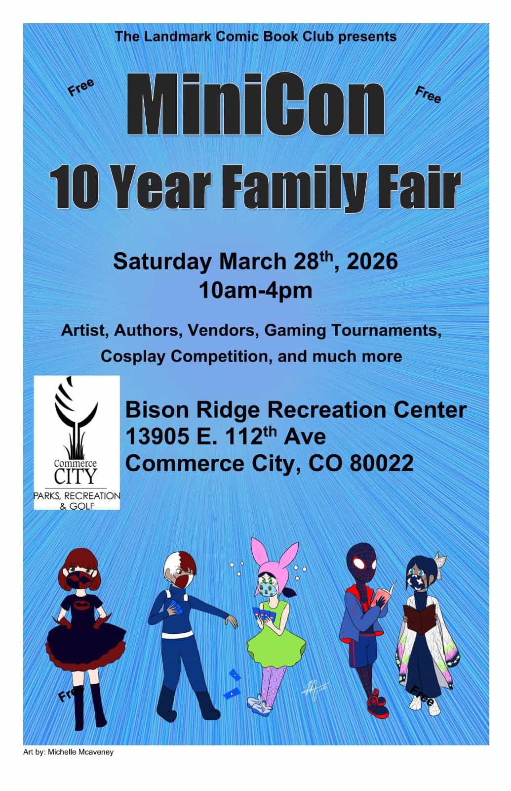 Commerce City MiniCon is a family-friendly festival featuring comics, cosplay and all things pop culture. Enjoy superheroes, otherworldly characters, comic-themed activities and crafts, cosplay contest, exhibits, trivia and more. This FREE event is on Saturday, March 28, 2026, from 10 a.m. to 4 p.m. at Bison Ridge Recreation Center.