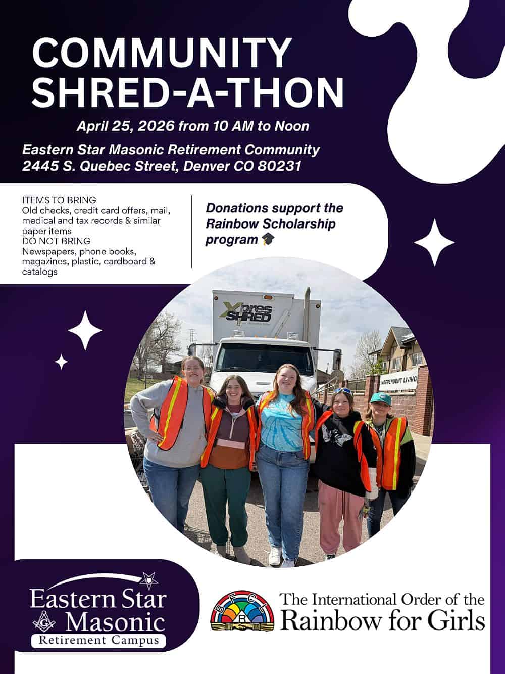 It might be a good idea to finish up that spring cleaning by going through all those old storage boxes and file cabinets, gather all of your “no-longer-needed” documents and get them safely shredded. The Eastern Star Masonic Retirement Community is the site for a Shred-A-Thon on Saturday, April 25, 2026, from 10 a.m. to noon.