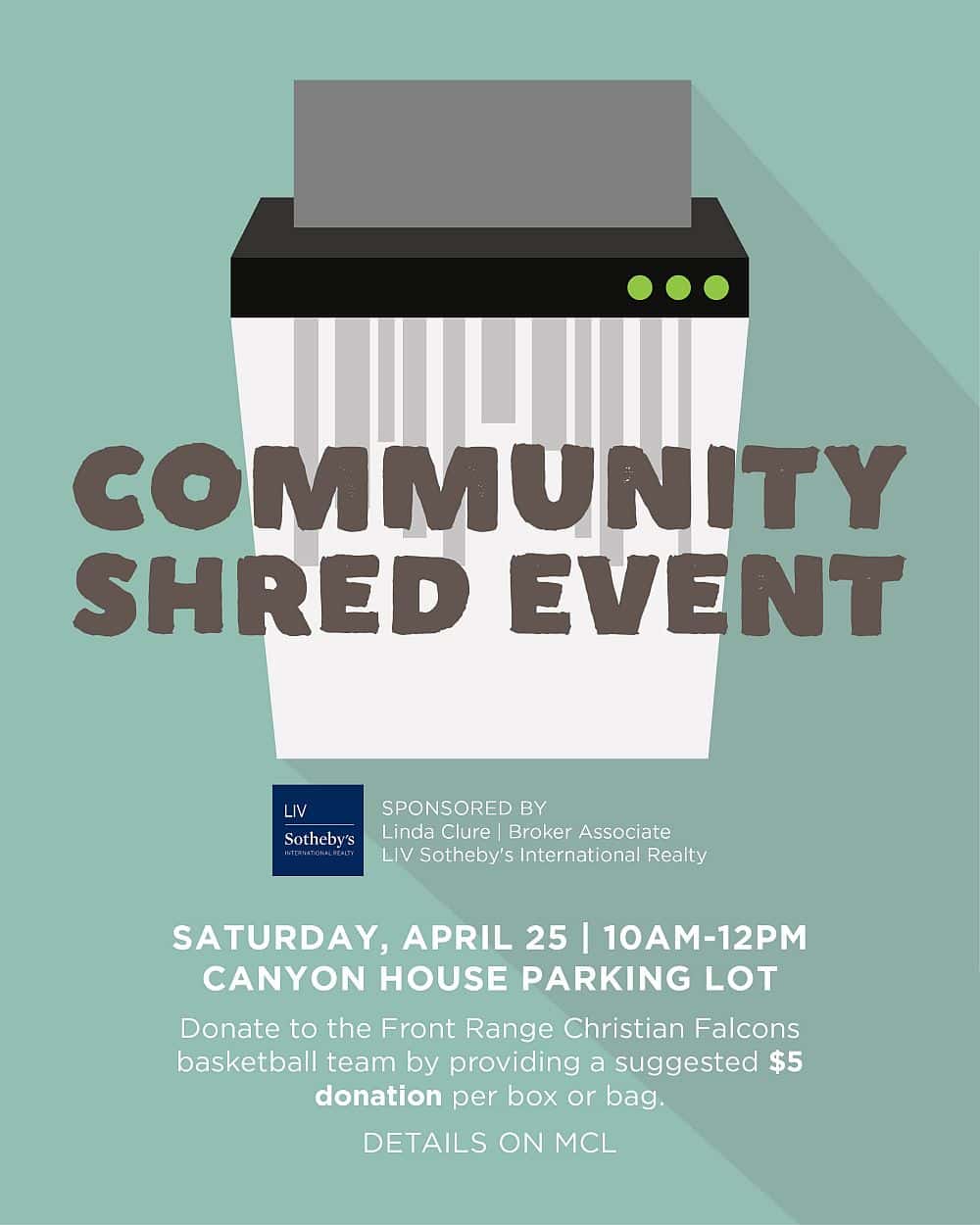 Canyon House Kitchen + Cocktails in Castle Pines is the site for a Shred-A-Thon on Saturday, April 25, 2026, from 10 a.m. to noon. This is an easy way to protect your identity and safely dispose of sensitive documents. The FREE event is sponsored by Linda Clure | Broker Associate LIV Sotheby’s International Realty