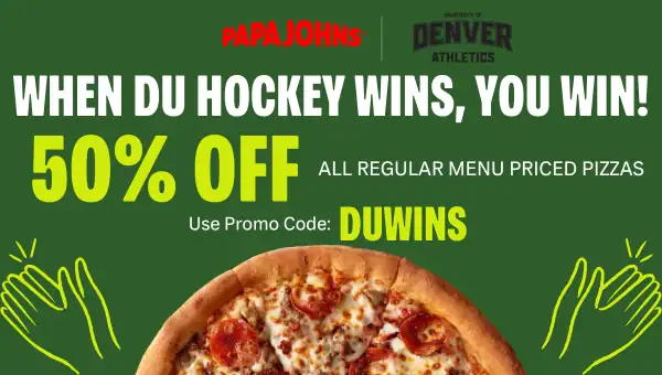 The offer is valid today, March 15, 2026! Score, Papa John’s and DU Hockey fans! When it comes to hockey, there’s lots of action on the ice. However, for DU hockey fans, there’s also lots of action at Papa Johns the day after they’re victorious. Papa Johns is a proud sponsor of the University of Denver hockey team. So it makes sense that they would celebrate every time the team wins.