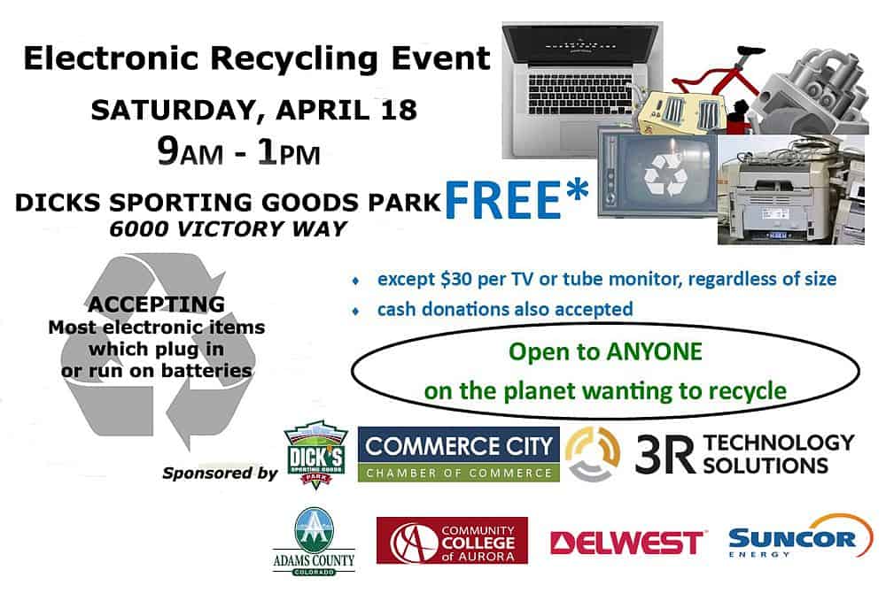 Got old electronics cluttering your house? If it can be plugged in or runs on batteries, we know a place that will take it…for FREE! The Commerce City Chamber, 3R Technology Solutions, Adams 14 and others are hosting an Electronics Recycling event on Saturday, April 18, 2026, from 9 a.m. to 1 p.m. at Dick’s Sporting Goods Park and you do NOT have to live or work in Commerce City to take part.