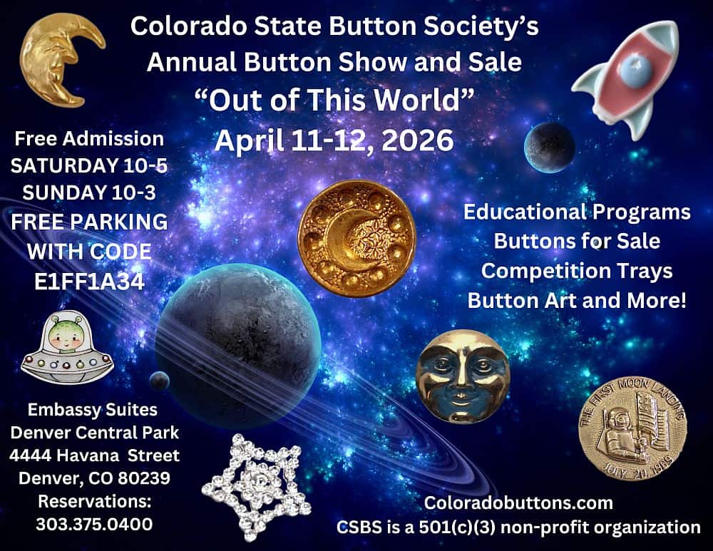 Button, button, who’s got the button? The Colorado State Button Society has a ballroom full of them during their Annual Show and Sale on Saturday & Sunday, April 11 & 12, 2026, at the Embassy Suites by Hilton at Denver Central Park. Both crafters and collectors can explore thousands of vintage, antique and contemporary buttons displayed by dealers from across the United States.