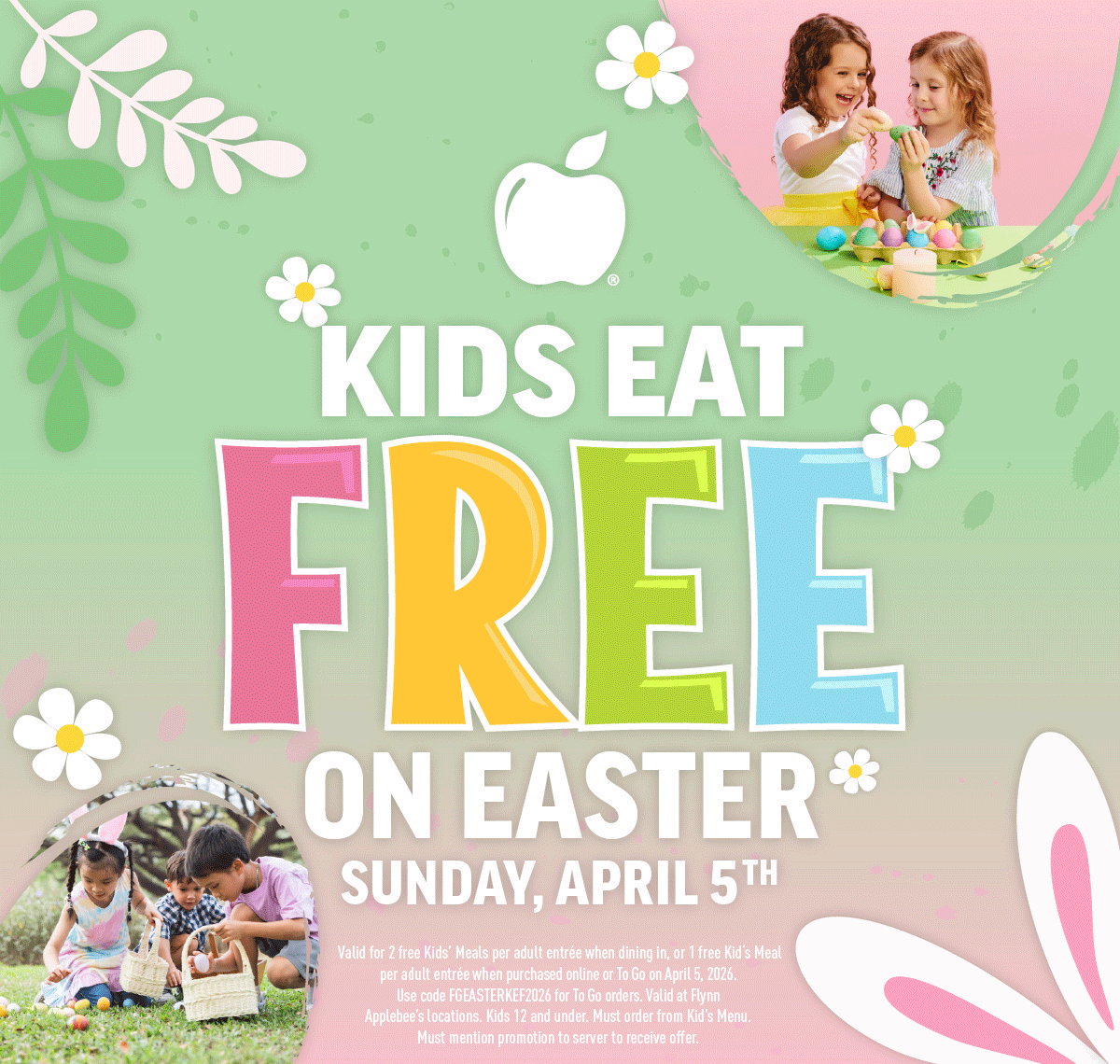 On Easter Sunday, kids (12 and under) eat FREE with the purchase of an adult entrée at participating Applebee’s locations — dine-in only. Limit two (2) kids’ meals per adult entrée purchased.