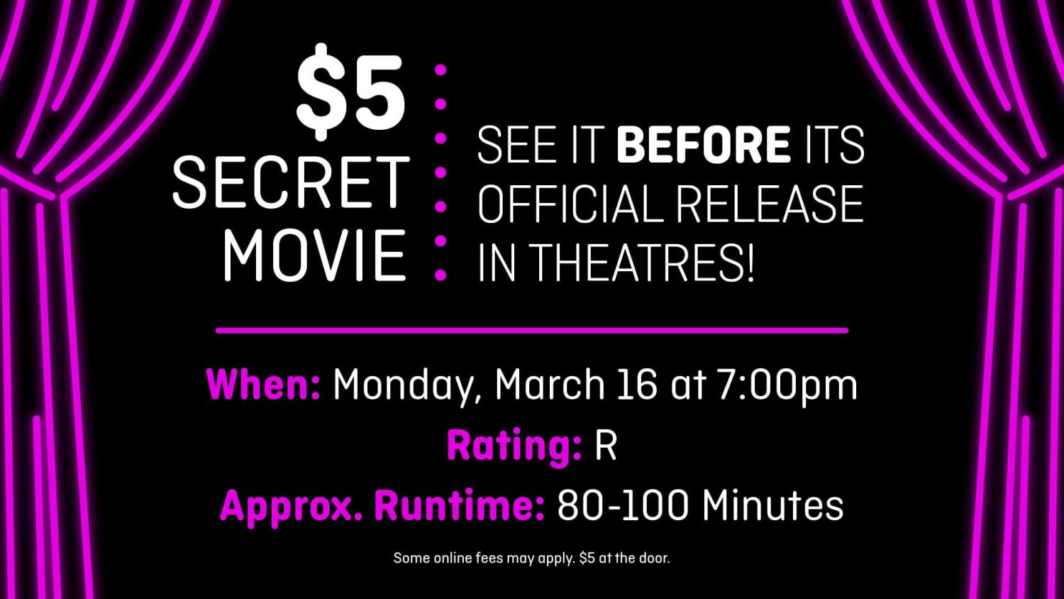 The film is Rated R with a running time of 80 to 100 minutes. (They no longer share the exact running time because many film sleuths could deduce the title of the “secret” movie by just reviewing the schedule of upcoming releases and looking at ratings and running times.)