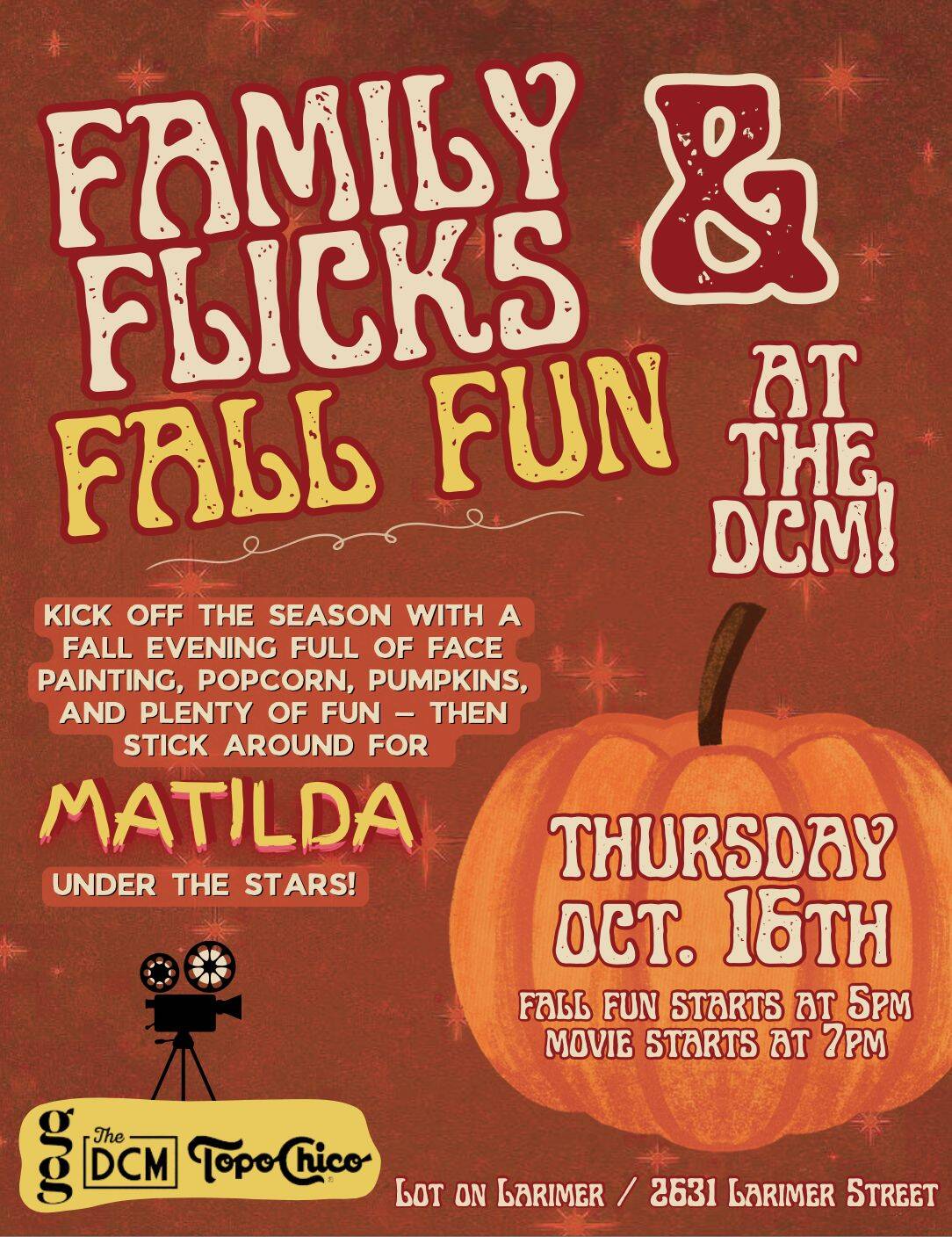 Denver Central Market hosts an evening of family fun on Thursday, October 16, 2025, featuring a screening of the film Matilda at 7 p.m. The FREE celebration kicks off with face painting from 5 p.m. to 7 p.m., plus pizza from Vero, sweet treats from Temper and free popcorn for all. It’s a cozy fall night of food, film, and community in RiNo.