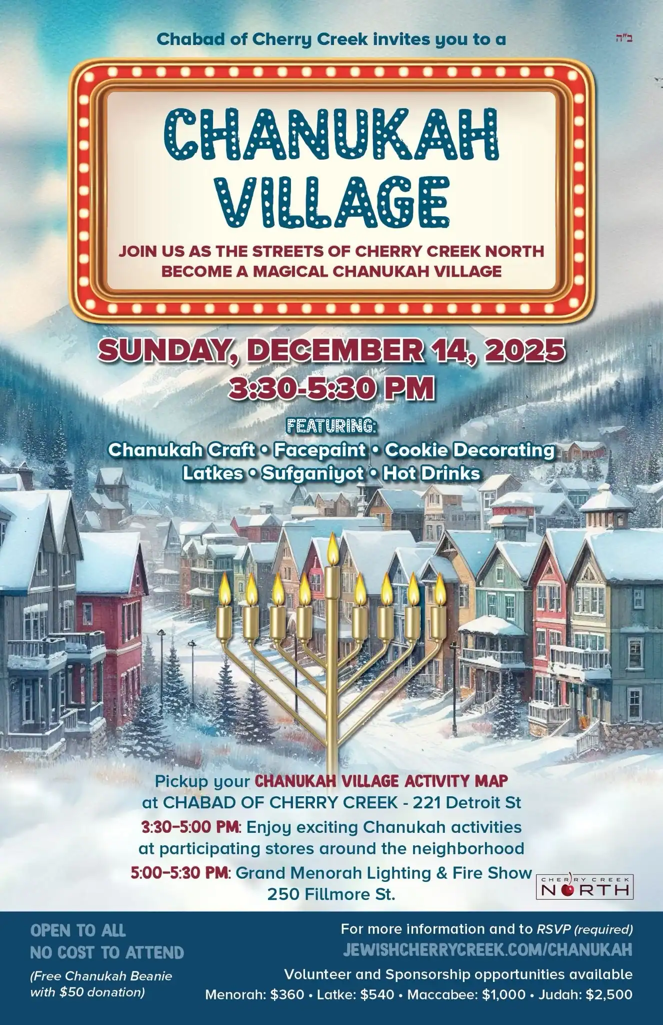 Chabad of Cherry Creek hosts a Chanukah menorah lighting on Sunday, December 14, 2025, from 3:30 p.m. to 5:30 p.m. The entire community is invited to enjoy the ceremony which transforms the streets of Cherry Creek North into a magical Chanukah Village.The FREE event includes face painting, traditional sweet treats (including hot latkes) and activities for all ages.