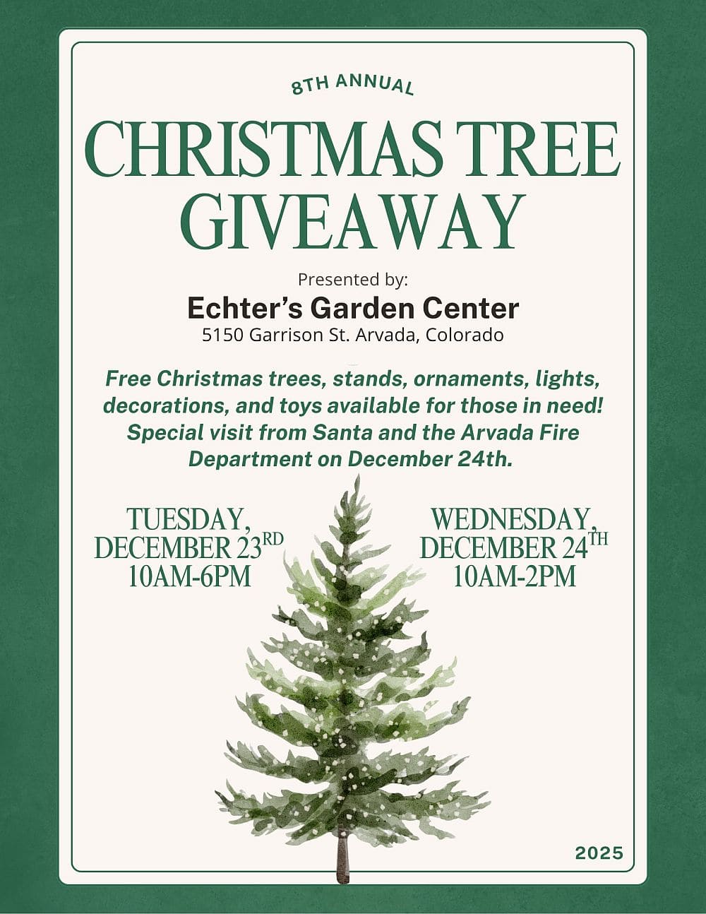 For those who still don’t have a Christmas tree because they can’t afford it, Arvada’s Echter’s Nursery & Garden Center is once again giving away FREE Christmas trees. Trees will be available on Tuesday, December 23, 2025, from 10 a.m. to 6 p.m. while supplies last. Echter’s is also giving away FREE ornaments, lights and tree stands!