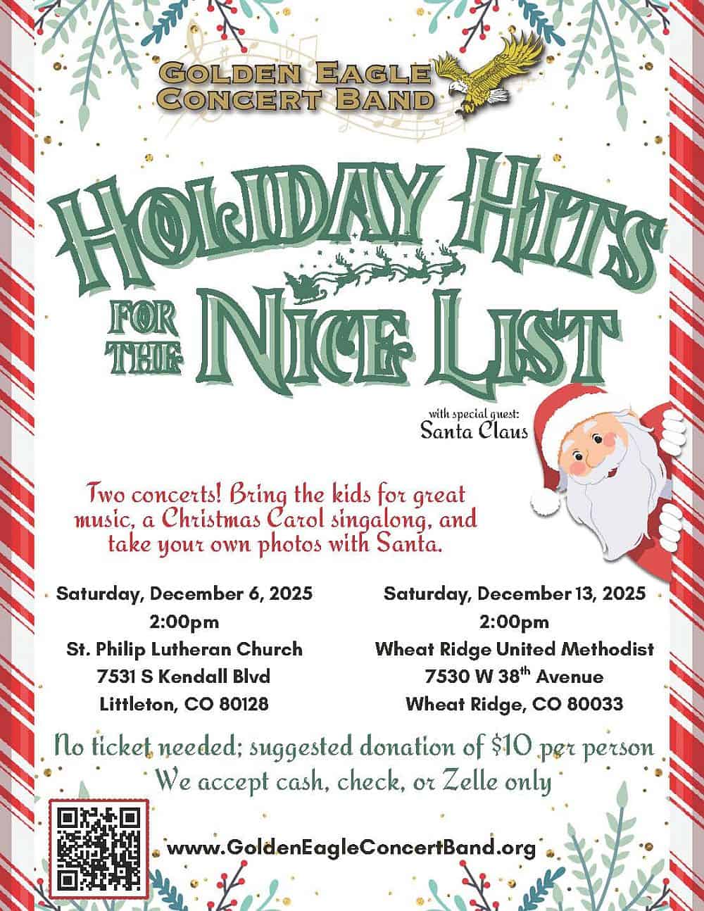 The Golden Eagle Concert Band will perform two holiday concerts. Holiday Hits for the Nice List will be presented on Saturday, December 6, 2025, at 2 p.m. at St. Philip Lutheran Church in Littleton, and Saturday, December 13, 2025, at 2 p.m. the Wheat Ridge United Methodist Church Admission is free; a suggested donation of $10 is appreciated.