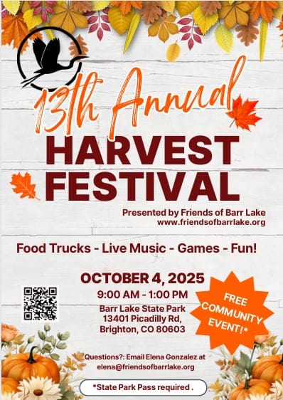 Celebrate fall with a fun-filled day at the Friends of Barr Lake’s Harvest Festival on Saturday, October 4, 2025, from 9 a.m. to 1 p.m. at Barr Lake State Park. Enjoy amazing local food, shop from unique vendors, meet live goats, explore a pumpkin patch and take part in some fun arts and crafts. The festival itself is FREE, but the Park entry fee is required.