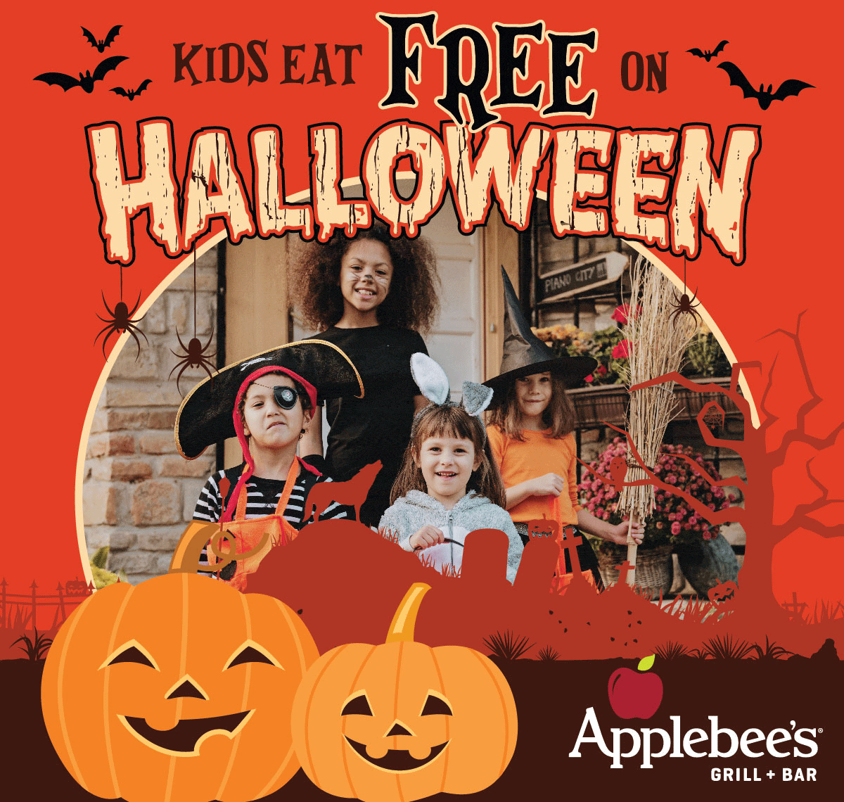 The offer is only available for dine-in and to-go orders — not valid on delivery orders. You must mention the Halloween offer to your server. For online to-go orders via Applebee’s site or app, use promo code HALLOWEEN2025 at checkout.