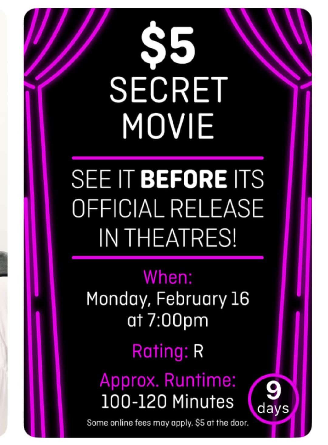 The next secret screening is on February 16, 2026 at 7 p.m. at The Landmark Greenwood Village (5415 Landmark Place).