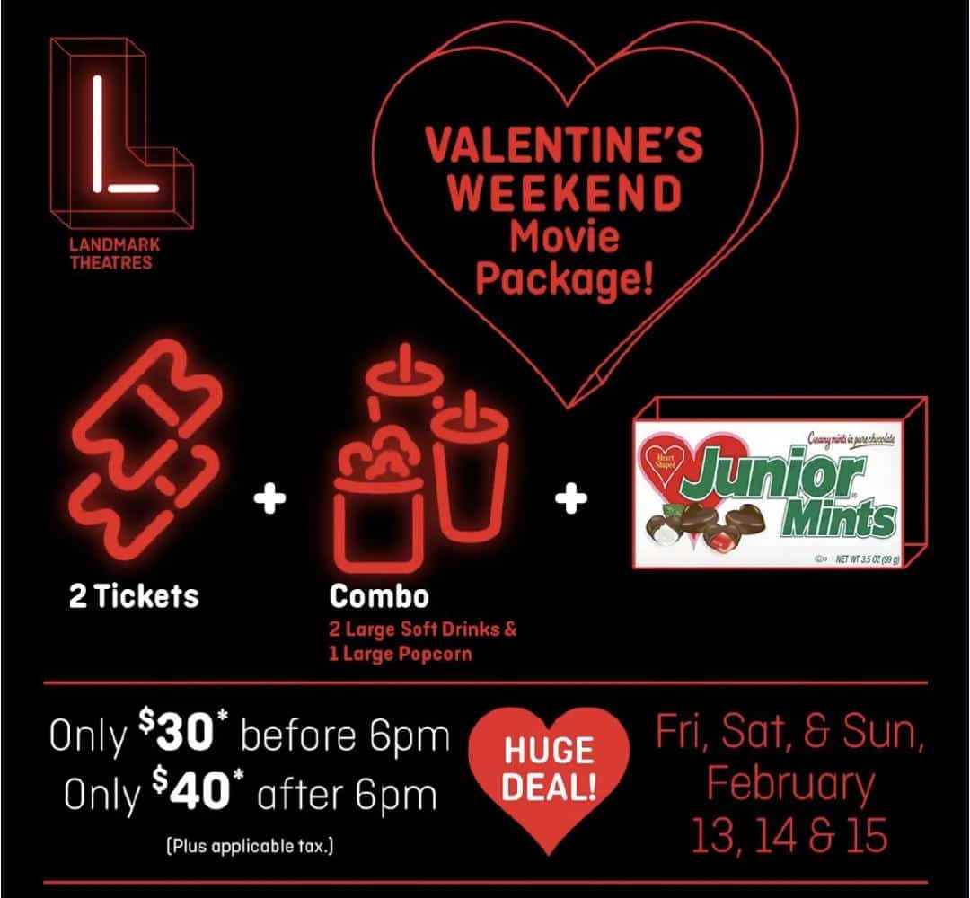 And Valentine’s Day is the perfect opportunity to enjoy a “date night” at the movies. Thankfully, Landmark Theatres is making it more affordable by offering a blockbuster deal over the Valentine’s Day weekend.