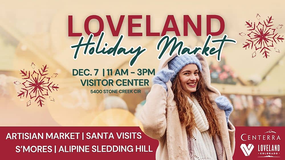 Visit Loveland and Centerra are proud to present the Loveland Holiday Market! Celebrate the season at the Loveland Visitor Center on Sunday, December 7, 2025, from 11 a.m. to 3 p.m. Bring your family and friends for a festive day filled with holiday shopping, winter fun, cheerful community spirit and holiday cheer.