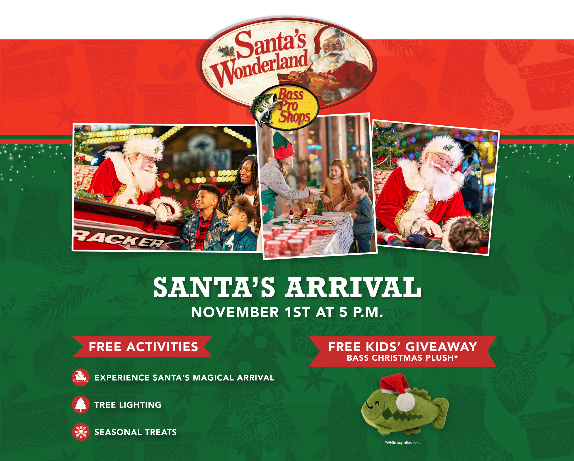 Kids can catch their first glimpse of Santa when he makes his Grand Entrance at Bass Pro Shops and Cabela’s on Saturday, November 1, 2025. In case you’re wondering how he can be at three simultaneous arrival parties, just know that Santa’s magic allows him to be at all three spots at the same time. Festivities start about 5 p.m. with an Arrival Parade in front of each store.