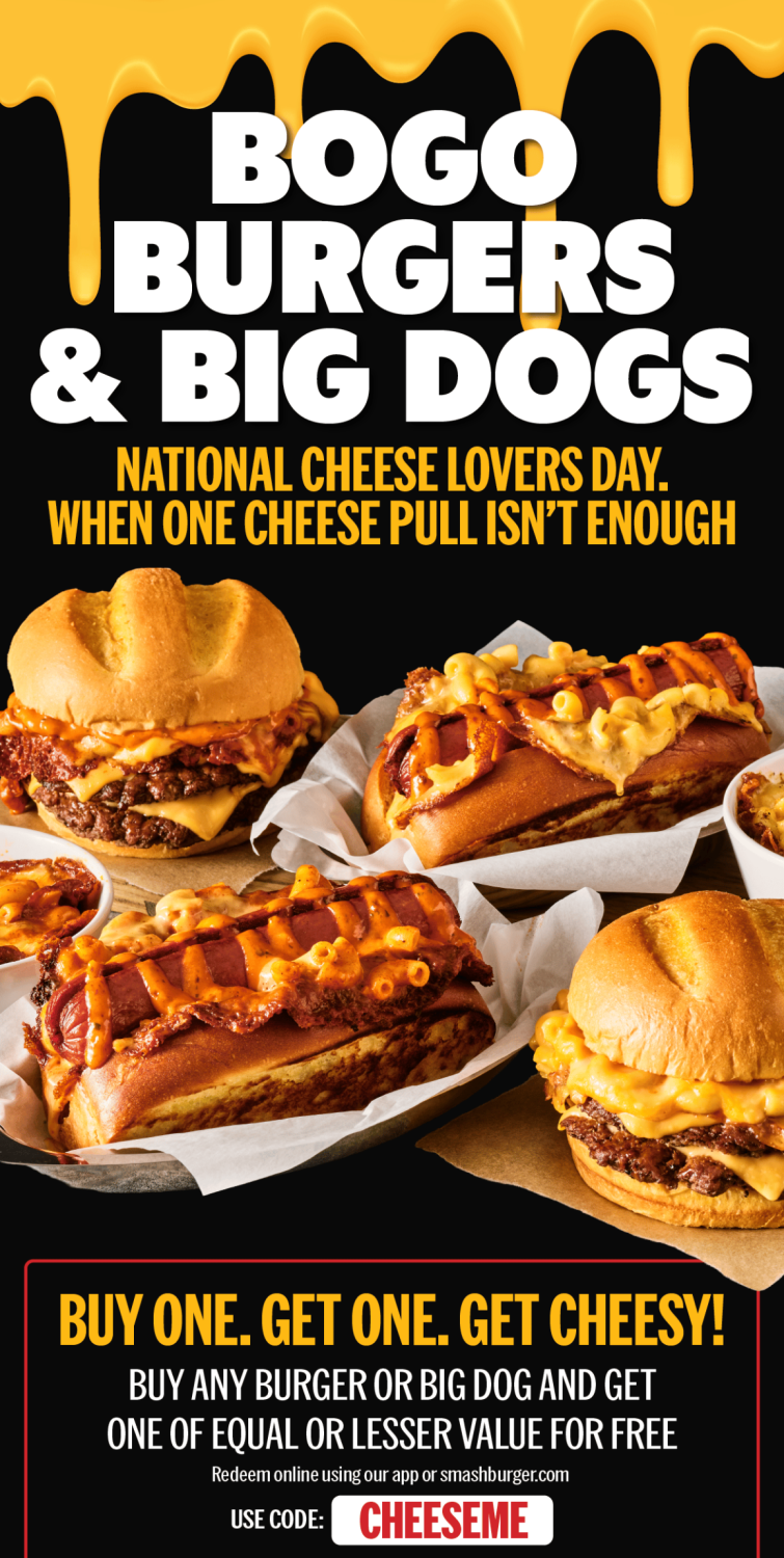 Use promo code CHEESEME at checkout for orders placed online via Smashburger’s site or app.
