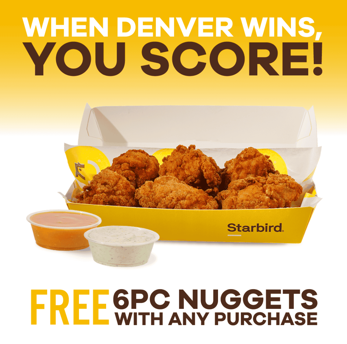 For the 2025 basketball season, Starbird is giving away 6 chicken nuggets for FREE with any purchase the day following a Denver Nuggets victory — in-restaurant only.