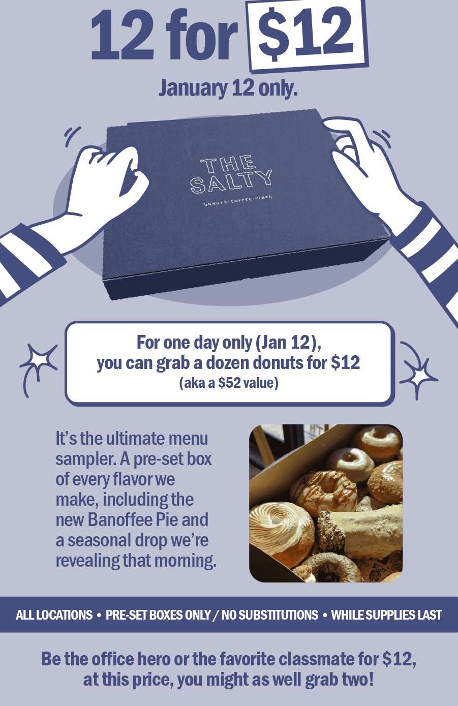 On January 12, 2026, The Salty is offering a dozen donuts for just $12 at its locations nationwide.