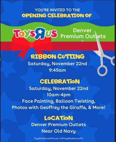 Denver Premium Outlets will host the grand opening of the Toys “R” Us Pop-Up store, featuring an appearance from the famous mascot, Geoffrey the Giraffe on Saturday, November 22, 2025 from 9:30 a.m. to 4 p.m. The grand opening ceremony will include a ribbon cutting, FREE toy goodie bags and special offers from Denver Premium Outlets’ stores.