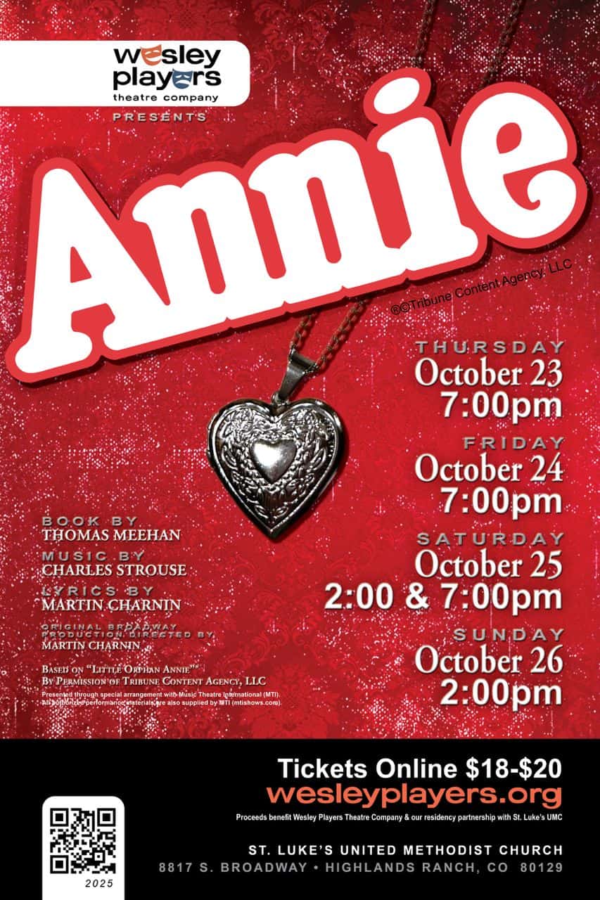 With a full orchestra and an ever-so-talented, inter-generational cast of 50 people, the Highlands Ranch-based Wesley Players Theatre Company presents five performances of Annie. Performances will be held at St. Luke’s United Methodist Church, October 23 to 25, 2025, at 7 p.m., with a 2 p.m. matinee on October 25 & 26, 2025.
